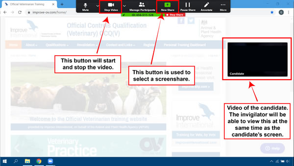 - Once your invigilator has joined the call, you will need your camera on and must share your screen, so that your invigilator can see both you and your screen at all times. The image below shows what the Zoom screen will look like.